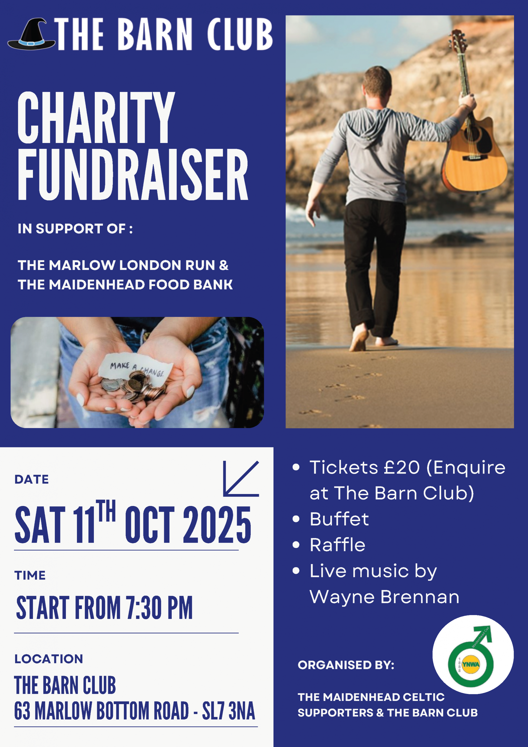 Charity Night From 7:30pm, Tickets £20 (enquire at the Club) Live Music (Wayne Brennan) Buffet & Raffle In Support of The Marlow London Run & The Maidenhead Food Bank Organised by The Maidenhead Celtic Supporters & The Barn Club + Add to Google Calendar + iCal / Outlook export 00 days 00 hours 00 minutes 00 seconds Date Oct 11 2025 Time 7:30 pm