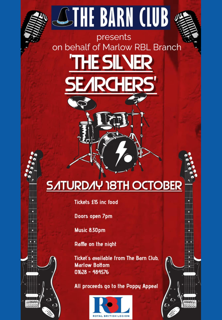 Poppy Dance From 7:00pm, Tickets £15 (enquire at the Club) Live Music (Silver Searchers) Buffet & Raffle All proceeds go to the Poppy Appeal Organised by The Barn Club on behalf of the Marlow RBL Branch + Add to Google Calendar + iCal / Outlook export 00 days 00 hours 00 minutes 00 seconds Date Oct 18 2025 Time 7:00 am - 11:00 pm